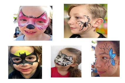 Batman, kočička, drak a spousta jiných obrázků za použití barev na obličej.